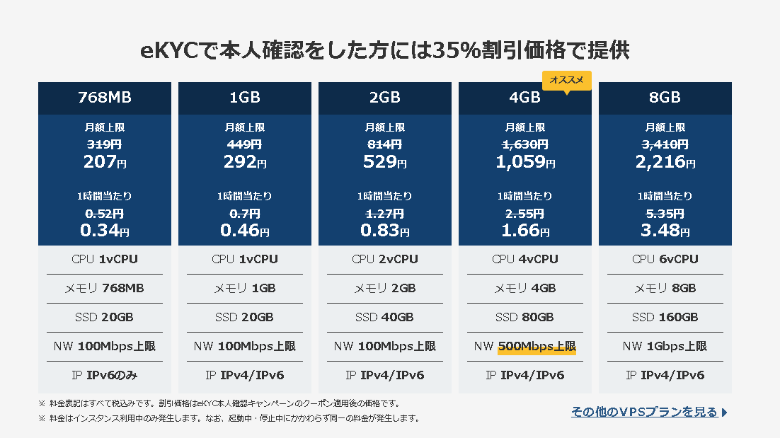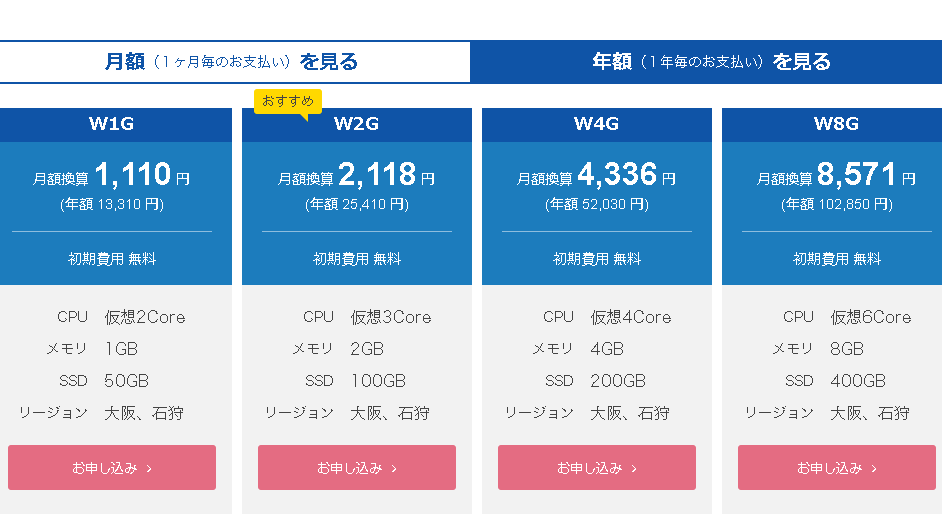 MT4一つならメモリ2GBのプランになりますが、キャンペーン中ということもあって月額1386円~とかなり安くなっています。