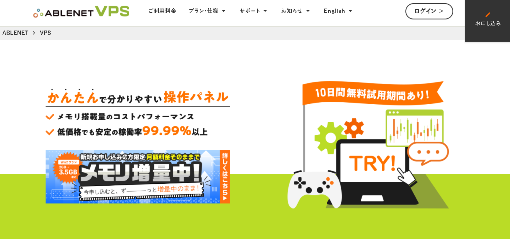 ABLENET VPSには最大10日間の無料お試し期間があります。