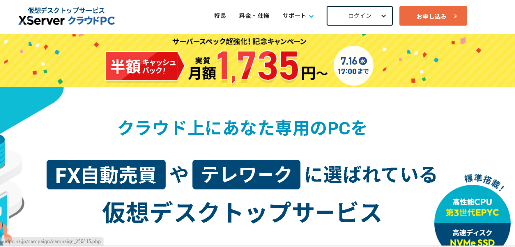 XserverクラウドPC お試し期間初回14日間